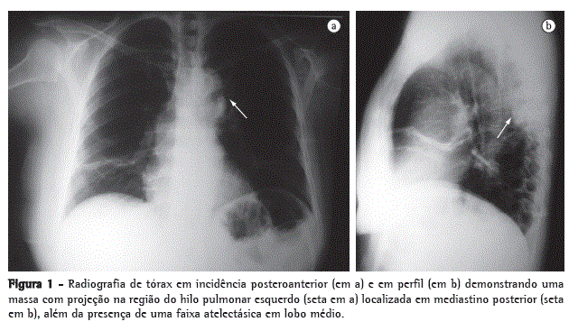 As manifestações clínicas da DC variam desde formas assintomáticas ou com discreta linfadenopatia localizada até formas recorrentes de linfadenopatia generalizada com sintomas sistêmicos severos.(9) Na forma unicêntrica, ocorre linfadenomegalia, localizada geralmente no mediastino ou abdômen, mas também pode se apresentar como um nódulo pulmonar ou em locais como pelve, axila e pescoço.(10,11) Os sintomas podem ser decorrentes do efeito compressivo da lesão ou a DC pode ser um achado incidental em exames de imagem de pacientes assintomáticos.(7,9) Nesta paciente, a DC se manifestou como massa única em mediastino posterior, sem sintomas sistêmicos.