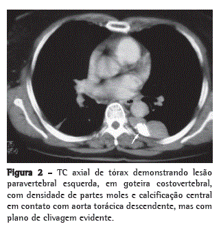 A radiografia de tórax evidenciou uma massa em topografia de mediastino posterior, que foi confirmada no pré-operatório por TC de tórax, na qual foi identificada uma massa heterogênea com calcificação densa em topografia de goteira costovertebral esquerda (Figuras 1 e 2).
