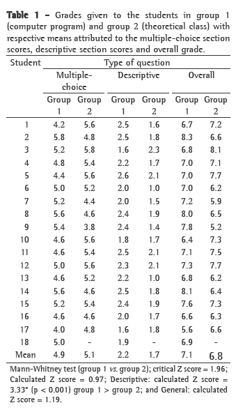 An acceptable test of the program depended on the test being blind. Therefore, neither the group of three professors who prepared the objective test nor the professor who applied it was familiar with the program. In terms of the results on the multiple-choice section of the test, there was no significant difference between the grades of students attending the class given by the professor and those of students studying with the computer program. However, when we analyzed the descriptive section of the test, we found that the students studying with the program achieved significantly better results than did the students attending the theoretical class. Therefore, computer-based study might lead to better assimilation of knowledge, due to the nature of multimedia resources and to the possibility of immediately and individually going back a step when necessary. This improved assimilation of knowledge might be more advantageous when writing out an answer rather than when simply choosing the best alternative. The difference between the groups regarding the grades on the descriptive section was not significant and did not influence the overall grades on the test, which were comparable between the two groups.