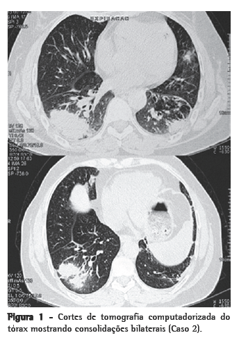 Paciente feminina, 58 anos, não-tabagista, iniciou com tosse, emagrecimento moderado, cansaço e dores articulares. Tinha antecedentes de asma na infância, com reinício após os 40 anos, que relacionava ao contato com tintas e solventes no trabalho. Uso inalatório diário de formoterol e budesonida 12/400 µg, com bom controle dos sintomas. A radiografia e tomografia de tórax mostravam consolidações bilaterais e algumas bronquiectasias em lobos inferiores (Figura 1). Os exames laboratoriais revelaram: hematócrito, 41,1%; hemoglobina, 13,7 g/dL; leucócitos, 8.970/mm3, com linfopenia (1.076 linfócitos); plaquetas, 285.000; FAN reagente (1:160), com padrão nuclear pontilhado; VHS, 56 mm; e proteína C reativa, 27,60 mg/L. Na época, suspeitou-se granulomatose de Wegener, pela presença no soro de antineutrophil cytoplasmic antibody (ANCA, anticorpo anticitoplasma de neutrófilos). Não foi notado comprometimento das vias aéreas superiores. Foi iniciada terapêutica com ciclofosfamida. Ainda no primeiro mês, foi notado um aumento do gânglio cervical anterior esquerdo. À biópsia do linfonodo, foi identificada linfadenite crônica granulomatosa com extensa necrose não-caseosa (Figura 2). A pesquisa de BAAR foi negativa. Pela suspeita de tuberculose, recebeu o esquema RHZ por 6 meses, apresentando melhora clínica. Entretanto, nos dois anos seguintes, persistiu com cansaço, dores articulares, episódios pneumônicos circunscritos e lesão oral na base da língua nos últimos 6 meses, fazendo uso temporário de corticosteróides sistêmicos e antibióticos (5 a 6 vezes, por 10 a 14 dias). Com o incremento desses sintomas, procurou novamente atendimento. Exames laboratoriais mostraram FAN 1:80, padrão nuclear homogêneo; anti-DNA não-reagente, linfopenia e VHS de 65 mm. A revisão do diagnóstico anatomopatológico confirmou linfadenite crônica granulomatosa com necrose e numerosos histiócitos vacuolados, presença de células gigantes tipo Langerhans e pesquisa de BAAR e de fungos negativas. Adicionalmente, foi realizado painel de imunohistoquímica: CD68 (KP-1) positivo (histiócitos xantomatosos) e mieloperoxidase negativa, sugestivo de DKF (Figura 2). Considerou-se então estar a paciente apresentando evolução combinada da doença (não diagnosticada há dois anos) com lúpus eritematoso sistêmico (LES), passando a ficar controlada pelo acréscimo de azatioprina oral (100 mg/dia) e prednisona (40 mg/dia) progressivamente descontinuada, com melhora clínica e dos exames laboratoriais e tomográficos, em 1 mês.