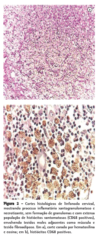 Paciente feminina, de 28 anos, não-tabagista, com história de tratamento para pneumonia há um ano, procurou atendimento médico devido a discretos sintomas constitucionais e dor pleurítica em hemitórax esquerdo. A radiografia e tomografia de tórax evidenciaram consolidações bilaterais, com posterior escavação da consolidação em segmento posterior do lobo superior esquerdo (LSE). A baciloscopia do escarro foi negativa. O exame broncoscópico demonstrou mucosa brônquica do LSE hiperemiada e edemaciada, compatível com processo inflamatório. No lavado brônquico, a pesquisa de bacilo álcool-ácido resistente (BAAR) foi negativa e a cultura para Mycobacterium tuberculosis foi positiva (observação de crescimento de apenas duas colônias). Recebeu o esquema contendo rifampicina, isoniazida e pirazinamida (RHZ) por 6 meses, com melhora clínica e radiológica. Um ano após, consultou novamente com febre há três semanas, artralgias e aumento de linfonodos submandibulares. Os exames laboratoriais mostraram: hematócrito, 38,7%; hemoglobina, 13,1 g/dL; leucócitos, 2.180/mm3, com 569 linfócitos; velocidade de hemossedimentação (VHS), 27 mm; fator antinuclear (FAN) reagente (1:320), com padrão nuclear homogêneo; anti-DNA não-reagente; e fator reumatóide não-reagente. À radiografia de tórax, alterações de aspecto residual no LSE. Devido à história de tuberculose, foi reiniciado o tratamento com o esquema RHZ, que foi suspenso após o surgimento de rash cutâneo, com a substituição da pirazinamida por etambutol. O tratamento foi interrompido após 1 mês devido ao resultado da biópsia dos linfonodos: havia processo inflamatório xantogranulomatoso e necrosante, sem formação de granulomas e com extensa população de histiócitos xantomatosos (CD68 positivos); e pesquisa de BAAR e de fungos negativas. Os achados não foram sugestivos de tuberculose, sendo portanto considerada a possibilidade de DKF. A paciente foi tratada sintomaticamente, com melhora das artralgias e resolução da febre em 1 mês. Em 18 meses, não mais apresentou alterações clínicas, apresentando FAN não-reagente.