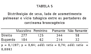 Não houve diferença significativa quanto à localização do tumor pulmonar, direita ou esquerda, quando os pacientes foram comparados com relação ao vício tabágico e ao sexo (Tabela 5 ).