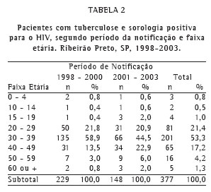 Em Ribeirão Preto, no período de 1998 a 2003, foram notificados 1.273 casos de TB, sendo que 377 apresentaram sorologia positiva para o HIV. A taxa média de co-infecção para o período estudado foi de 30%.