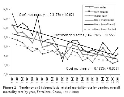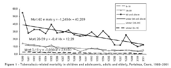 The incidence, prevalence and the number of reported cases of tuberculosis in the city of Fortaleza, located in the state of Ceará, have presented a trend toward a decrease since 1995. Among the possible causes of this decrease are the underdiagnosis and underreporting of the disease, in addition to the actual reduction of the transmission of the infection. The underreporting of cases observed ranged from 3% in 1995 to 18.5% between 2000 and 2002.(8) The increase in the mortality and lethality rates can be indirect indicators of delayed diagnosis. The objective of this study was to evaluate the evolution of tuberculosis-related mortality between 1980 and 2001, as well as to identify gender-related and age-related trends, in Fortaleza.