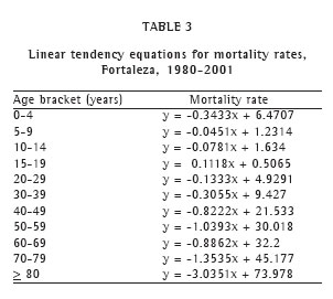 In the period studied, the mean overall mortality rate (deaths/1000 inhabitants) in Fortaleza was 5.7 (standard deviation of 0.8), ranging from 7.7 in 1980 to 4.7 in 1992. In relation to 2001, the overall mortality rate in Fortaleza was higher only in 1981 and 1982 (p < 0.05), thereafter remaining stable (p > 0.05) (Table 1). The tendency of the adjusted overall mortality rate was toward a decrease in the period (y = -0.1191x + 7.7158).