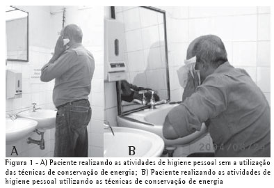 Segundo alguns autores,(22) no que concerne à conservação de energia e treino das AVD, os objetivos são: treinar a respiração diafragmática, primeiro em repouso para que o paciente tenha percepção dos movimentos respiratórios durante a inspiração e expiração e, depois, durante a realização das tarefas, evitando que o paciente faça breves períodos de apnéia; treinar os membros superiores, visando ao aumento da tolerância ao trabalho; programar atividades com níveis distintos de exigência, iniciando com atividades leves, lentas e com menor gasto energético, por exemplo treinar primeiramente atividades de higiene pessoal em posição sentada e com apoio dos membros superiores (escovar dentes, pentear cabelos, fazer a barba, lavar o rosto, maquiar-se) e, depois, sentada sem apoio de membros superiores (depilar axilas e tomar banho); simplificar o desenvolvimento de algumas tarefas, adaptando o ambiente, como elevação do vaso sanitário, colocação de barras de apoio e corrimão no banheiro, ou fazendo uso de tecnologia assistiva, como calçadeira de cabo longo, pente com cabo longo, andadores com assento e cesta de bagagem, entre outros; eliminar atividades desnecessárias, como enxugar louças (uso de escorredor), secar-se após o banho (uso de roupão felpudo) ou amarrar sapatos (preferir calçados sem cadarços); orientar quanto à importância em solicitar auxílio de familiares, cuidadores ou outros, quando necessário; organizar o tempo, planejando o dia e a semana, considerando os tempos gastos na realização das atividades e o tempo necessário para descanso, incentivando o uso de agendas; organizar o ambiente de modo que os materiais a serem utilizados pelo paciente permaneçam em locais de fácil acesso, ou seja, entre as cinturas escapular e pélvica, evitando a necessidade de grandes amplitudes de movimento de membros superiores sem sustentação, além da flexão de tronco; orientar quanto às posturas mais adequadas na realização de cada uma das tarefas, adaptando a forma de realizar as atividades, ou seja, quando o paciente tiver que utilizar os braços deve fazê-lo com apoio em uma mesa, bancada ou mesmo no lavatório do banheiro, além de evitar a flexão do tronco.