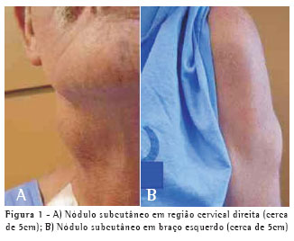Ao exame físico, estava em bom estado geral e, além da febre, evidenciavam-se roncos esparsos em ambos os hemitóraces e nódulos subcutâneos na região cervical direita e braço esquerdo, com 5 cm de diâmetro, sem sinais flogísticos (Figura 1).