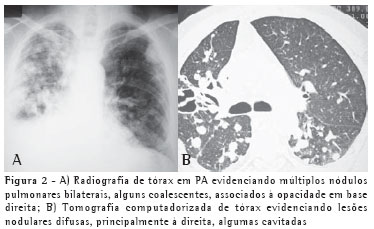 A radiografia de tórax mostrava múltiplos nódulos disseminados por ambos os pulmões (mais proeminentes à direita), associados a velamento do seio costofrênico direito. A tomografia computadorizada de tórax confirmou a presença dos nódulos com tamanhos variados, sendo alguns cavitados (Figura 2). Os exames laboratoriais foram normais e a sorologia para o vírus da imunodeficiência humana e duas amostras de hemocultura foram negativas.