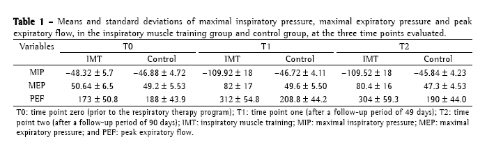 Physical training and IMT were performed three times a week for six consecutive days, totaling 18 sessions. Significant increases in MIP and MEP were reported in the group of patients who performed both physical training and IMT, as well as in that of those who performed IMT only. In both of those groups, respiratory muscle strength was maintained 30 days after the end of the sessions, whereas no changes in respiratory muscle strength were found in the control group. In addition, clinical symptoms improved in both study groups.