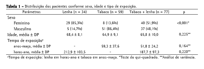 Analisados quanto à média de idade, os grupos mostraram-se homogêneos. O grupo exposto à fumaça de lenha apresentou média de 68,4 ± 8,1 anos; o exposto à fumaça de lenha e de tabaco, 65,8 ± 10,0 anos; e o exposto ao tabaco, 64,9 ± 9,1 anos (p = 0,225). Pacientes do sexo feminino predominaram nos grupos expostos à fumaça de lenha (85,3%) e à fumaça de lenha e de tabaco (51,9%). O percentual de pacientes do sexo masculino foi de 86,4% no grupo exposto ao tabaco. Essa diferença foi estatisticamente significante (p < 0,001; Tabela 1).