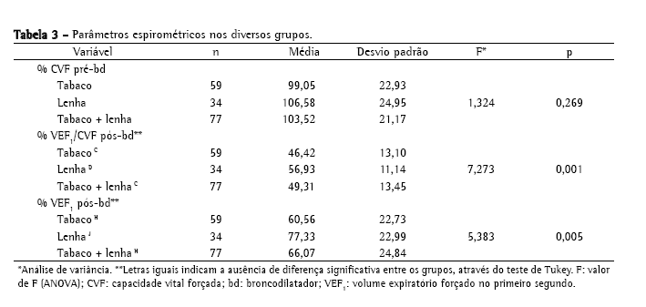 Os valores encontrados de CVF, VEF1 e da relação VEF1/CVF estão expressos na Tabela 3. Os três grupos estudados não diferiram quanto ao percentual de CVF pré-broncodilatador (p = 0,269). O grupo exposto à fumaça de lenha apresentou maiores valores de VEF1 e da relação VEF1/CVF pós-broncodilatador, em percentuais do previsto, em relação aos demais grupos (p = 0,001 e p = 0,005, respectivamente). Entre o grupo exposto ao tabaco e o exposto à fumaça de lenha e de tabaco não houve diferença estatisticamente significante quanto a essas variáveis (Tabela 3).