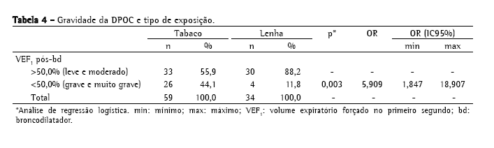 Os grupos foram diferentes entre si quanto à gravidade da DPOC, considerando como critério de gravidade o VEF1 pós-broncodilatador. No grupo exposto somente ao tabaco, 44,1% de pacientes apresentavam doença grave ou muito grave e no grupo exposto somente à fumaça de lenha, 11,8% (p = 0,006). A odds ratio para doença grave e muito grave foi cerca de seis vezes maior no grupo exposto ao tabaco (OR = 5,909; IC 95%; Tabela 4).