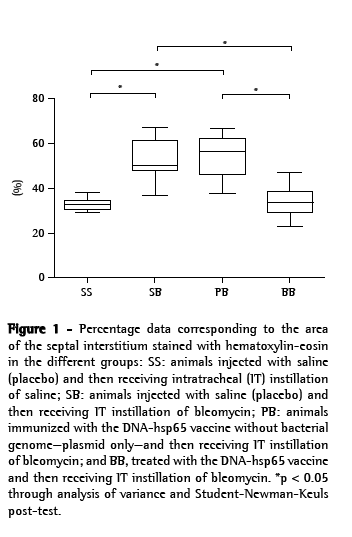 In summary, we can conclude that the data here obtained indicate that immunization with the DNA-hsp65 vaccine had a positive effect on the degree of deposition of the noncollagen matrix in a model of bleomycin-induced lung injury. Additional studies are necessary in order to elucidate more fully the effects that the vaccine has on pulmonary fibrotic processes.