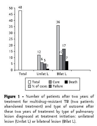 Between 2000 and 2006, there were 2,600 new cases of MDR-TB in Brazil.(11) However, in the same period, approximately 30,000 patients died (5,000 per year),(4) many of whom were still possibly sensitive to regimen I or at least to regimen III, or were never diagnosed with TB.(15) The impossibility of seeking or finding appropriate medical treatment, noncompliance with treatment and relapse, which are often related to alcoholism, poor socioeconomic conditions and HIV co-infection, explain the high mortality and the development of MDR-TB.(16-18) The directly observed therapy, short-course strategy, has been the most successful method to reduce noncompliance, the number of deaths and the number of MDR-TB cases, and its implementation has been made a priority in the country, although, to date, this has happened slowly and in a nonuniform manner.(19) It is of note that there were few ­HIV­/­AIDS cases and few cases of alcoholism in our sample. This is possibly due to the fact that the patients had already been selected from a larger group by having survived the initial manifestation of the disease. The gold standard for the diagnosis of primary resistance is the sensitivity test of the material obtained before the first treatment. Operationally, this is difficult, and that is why the definition presented was used, making it possible to diagnose MDR-TB more rapidly in the 6 patients, and only 1 patient received regimen III.(20) Techniques to identify clusters can definitely diagnose the identity of the strain exhibiting primary resistance with that of the index case.(21) Table 3 shows that there were only small differences between the cured and the uncured group in terms of the following items, which resulted in MDR-TB: number of previous treatments; number of patients who abandoned treatment; number of patients who relapsed; and number of patients who presented failure. Therefore, the great differential was the severity of pulmonary lesions, which depends on the virulence of the bacillus and the immunity of the patient in this phase.(22) In the initial 2-year period of treatment for MDR-TB, evolution was proportionally poorer and the number of deaths was proportionally greater among the patients with bilateral lesion and cavitation than among those with unilateral lesion. In addition, the number of deaths was 7 times greater among the patients with bilateral lesions. The incidence of TB is lower in females, and survival is higher in younger patients.(23) In the present study, patients in the older group were cured more often than were those in the younger group, and the number of females who were cured was 2 times lower than was the number of males cured (RR = 2). The severity of pulmonary lesions in the initiation of treatment for MDR-TB was more important than were natural protective factors. The initial 2-year period, in which the treatment for MDR-TB occurred, defined whether the outcome would be favorable (cure) or unfavorable (treatment failure or death). The patients who were cured clearly presented weight gain, whereas the worsening of the case and death were announced by a progressive weight loss throughout the follow-up period.(24)