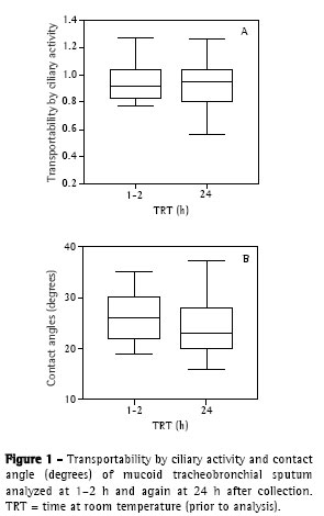 In the present study, there were no statistically significant differences in the ciliary transportability or contact angle of the mucoid sputum after 24 h at room temperature. We believe that the lack of alteration of the sputum properties was due to the small number of inflammatory cells, bacteria and enzymes present in the sputum of individuals without pulmonary diseases,(16) in addition to the fact that the method of collection results in little contamination by saliva.