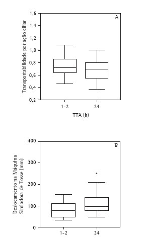 ResultadosNeste trabalho observou-se que não houve diferença estatisticamente significativa entre as amostras de muco mucóide analisadas em torno de 1 e 2 h após a coleta e aquelas analisadas após permanência de 24 h em temperatura ambiente, tanto para a transportabilidade por ação ciliar (média e desvio padrão: 0,87 ± 0,19 vs. 0,9 ± 0,2, respectivamente), quanto para o ângulo de contato (média e desvio padrão: 26 ± 3 vs. 23 ± 3 graus, respectivamente) (Figura 1).