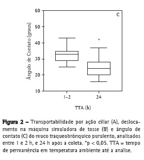 Em conclusão, o muco traqueobrônquico mucóide pode ser mantido em temperatura ambiente por 24 h, sem que ocorra alteração na sua transportabilidade por ação ciliar ou no seu ângulo de contato. O muco traqueobrônquico purulento, no entanto, não deve permanecer em temperatura ambiente por muitas horas, pois sofre alterações em suas propriedades físicas, podendo tornar-se liquefeito. Entretanto, como não foram realizadas análises intermediárias entre 2 e 24 h após a coleta, futuros estudos precisam ser feitos para se determinar qual o tempo máximo em que o muco purulento pode permanecer em temperatura ambiente, para se evitar alterações em sua estrutura e, conseqüentemente, em sua transportabilidade.