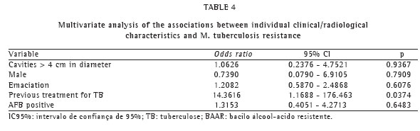 Table 3 shows the univariate analysis of the associations between individual clinical/radiological characteristics and M. tuberculosis resistance. For the multivariate analysis, the variables presenting significant statistical values (p < 0.10) were chosen. The results are presented in Table 4.