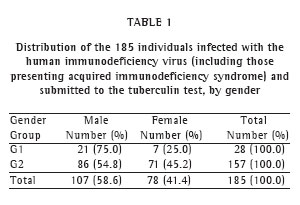 In order to select the patients, a retrospective study was conducted to evaluate the medical charts of 802 HIV-positive individuals (including those with AIDS), all of whom were treated in the Tropical Diseases Outpatient Clinic of the Botucatu School of Medicine of the Paulista State University between August of 1985 and March of 2003. The inclusion criterion was having had a PPD skin test.