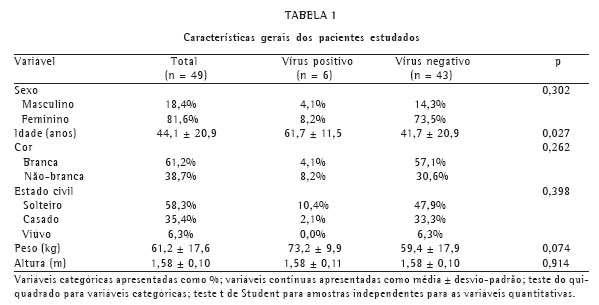Dos 49 pacientes estudados, 40 eram do sexo feminino (81,6%) e 9 do masculino (18,4%). Trinta pacientes eram de cor branca (61,2%) e 19 de cor não branca (38,7%). A média de idade dos pacientes estudados foi de 44,10 ± 20,93 anos. Seis pacientes tiveram amostras positivas para vírus respiratórios (12,2%). Os vírus identificados foram: adenovírus (3 casos), influenza A (2 casos) e parainfluenza tipo 1 (1 caso).