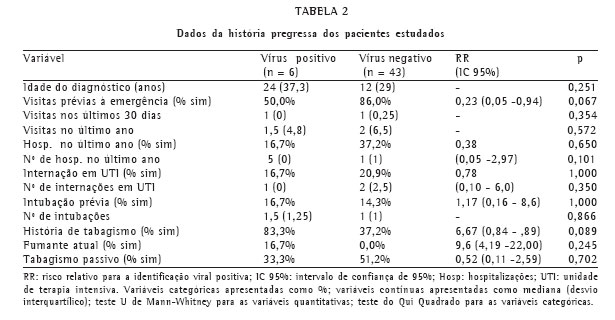 A Tabela 2 apresenta a análise dos dados da história pregressa. Nenhuma diferença estatisticamente significativa (p > 0,05) foi observada entre os grupos com identificação viral positiva e negativa para as seguintes variáveis estudadas: idade do diagnóstico de asma, visitas prévias à emergência, número de visitas à emergência nos últimos 30 dias e no último ano, hospitalizações no último ano, número de internações no último ano, internações em unidade de terapia intensiva, número de internações em unidade de terapia intensiva, intubações prévias, número de intubações prévias, história de tabagismo, tabagismo atual e tabagismo passivo.