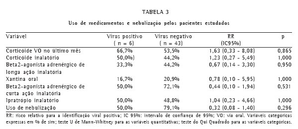 A Tabela 3 apresenta os dados referentes ao uso de medicamentos (corticóide oral no último mês, corticóide inalatório, beta2-agonista adrenérgico de longa ação inalatória, xantina oral, beta2-agonista adrenérgico de curta ação inalatória, brometo de ipratrópio inalatório) e uso de nebulização. Não foi identificada diferença estatisticamente significativa (p > 0,05) para estas variáveis entre os grupos com identificação viral positiva e negativa.
