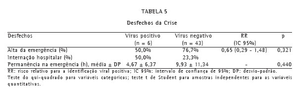 A Tabela 5 apresenta os desfechos da crise asmática. Cinqüenta por cento dos pacientes tiveram alta diretamente da emergência no grupo com identificação viral positiva e 76,7% no grupo com identificação viral negativa (p = 0,321). Cinqüenta por cento dos pacientes foram internados no grupo com identificação viral positiva e 23,3% no grupo com identificação viral negativa (p = 0,321). A permanência média na emergência foi de 4,67 h no grupo com identificação viral positiva e de 9,93 h no grupo com identificação viral negativa (p = 0,440).
