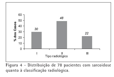 Utilizou-se a classificação radiológica habitual, recomendada pelo consenso das sociedades American Thoracic Society, European Respiratory Society e World Association of Sarcoidosis and Other Granulomatous Disorders,(1) incluindo-se os tipos radiológicos 0, I, II, III e IV (0 - radiograma normal, I - adenopatias hilares bilaterais e mediastinais, II - adenopatias e infiltração pulmonar, III - apenas infiltração pulmonar, IV - fibrose pulmonar), sendo todos os casos reavaliados pelos radiologistas do serviço. Os autores preferem a expressão "tipo" a "estágio" devido à sarcoidose ser uma doença sistêmica em que os achados de imagem do tórax freqüentemente não refletem sua fase evolutiva ou gravidade global. A tomografia computadorizada de alta resolução costuma mostrar aspectos típicos da doença, mas por motivos econômicos não foi realizada de rotina.