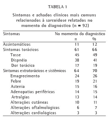 Entre os pacientes sintomáticos, 61 apresentavam sintomas torácicos (66%) e 64 apresentavam sintomas extratorácicos e sistêmicos (70%). Ocorreram sintomas exclusivamente torácicos em 17 casos (18%) e exclusivamente extratorácicos em 20 casos (22%); 44 apresentavam, concomitantemente, sintomas torácicos e extratorácicos, e também sistêmicos (48%). Dos sintomas torácicos, a tosse foi o mais freqüente, sendo referido por 45 pacientes (49%), seguindo-se dispnéia, por 38 (41%), e dor torácica por 17 (19%). Dentre as manifestações extratorácicas e sistêmicas, as mais freqüentes foram: emagrecimento em 24 casos (26%); febre em 19 (21%); astenia em 15 (16%); adenopatias periféricas em 14 (15%) e artralgias em 13 casos (14%). Alterações cutâneas ocorreram em 10 pacientes (11%), sendo que eritema nodoso foi diagnosticado em 6 (7%). Alterações oftalmológicas ocorreram em 6 pacientes (7%) e cardiológicas em 3 (3%). Episódios de litíase urinária ocorreram em 5 pacientes (5%) (Tabela 1).
