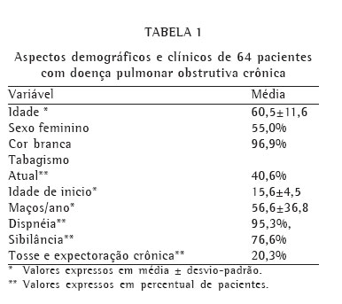 Os pacientes foram estratificados em três grupos, de acordo com o valor do percentual do VEF1 em relação ao previsto na etapa pré-broncodilatador: VEF1 = 60% do previsto - 19 pacientes (29,7%); VEF1 entre 40% e 59% do previsto - 27 pacientes (42,2%); VEF1 < 40% do previsto - 18 pacientes (28,1%).
