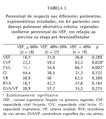 Outros autores estudaram 241 pacientes com doença obstrutiva, com o intuito de verificar se, mesmo na ausência de resposta nos fluxos expiratórios forçados, poderia haver alteração na CVL e nos volumes estáticos. Obtiveram resposta volumétrica isolada em 19%, resposta isolada nos fluxos em 20%, e resposta combinada em 7% dos pacientes.(11) Não foi observada resposta ao broncodilatador em 54% dos pacientes.