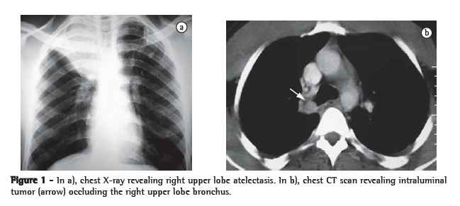 The bronchoscopic appearance of the lesion led us to the initial diagnosis of carcinoid tumor, a misdiagnosis that has also been reported by other authors.(2,4,7) In the previous reports, pulmonary resection was not necessary for the treatment of the endobronchial tumor.(1-8) However, in the present case, the tumor had obstructed the right upper lobe bronchus for at least 9 months, leading to pulmonary infection and parenchymal destruction. These findings led us to proceed to a right upper lobectomy with wedge bronchoplasty in order to achieve tumor-free resection margins. A thorough mediastinal lymph node dissection was not performed because of endotracheal tube dislodgement leading to respiratory instability at the end of the surgical procedure. However, in cases in which carcinoid tumor is suspected, at least a systematic lymph node dissection should be performed.