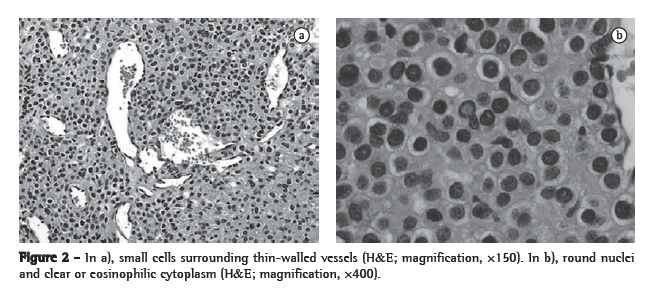 The pathological examination of the resected piece revealed a polypoid tumor in the right upper lobe bronchus, measuring 1.7 × 1.0 cm. The microscopic examination revealed a tumor formed by thin-walled vessels surrounded by small cells with round nuclei and clear or eosinophilic cytoplasm (Figures 2a and 2b). The resection margins were tumor-free. Immunohistochemical analysis showed the cells to be positive for smooth muscle actin (1A4) and neuron-specific enolase (NSE). Tests for cytokeratin (AE1/AE3 and CAM 5.2), chromogranin, thyroid transcription factor-1 (TTF-1) and S100 protein were negative. The final diagnosis was bronchial glomus tumor. There was no recurrence during the 14 months of follow-up.
