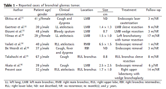 Several cases of glomus tumor arising from the trachea or the lung parenchyma have been reported.(5,8-10) However, only nine cases of glomus tumor arising from the bronchus have been published in the English-language literature, including the case reported herein.(1-8) To our knowledge, this is the first case report of a bronchial glomus tumor causing right upper lobe atelectasis (Table 1).