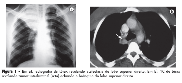Paciente do sexo masculino com 32 anos de idade relatou febre e tosse seca 9 meses antes da internação. Naquela ocasião, recebeu tratamento para pneumonia em outro local, mas a tosse seca continuou. O exame físico revelou sibilância do lado direito, e a radiografia mostrou atelectasia de lobo superior direito (Figura 1a). A TC de tórax revelou uma lesão endobrônquica ocluindo o brônquio do lobo superior direito (Figura 1b), sem adenomegalia mediastinal. A fibrobroncoscopia revelou um tumor endobrônquico localizado no brônquio do lobo superior direito. O tumor tinha uma superfície avermelhada lisa e havia obstruído o brônquio do lobo superior direito, sem protrusão para o brônquio principal direito. A biópsia forneceu resultados inconclusivos. O paciente foi submetido à toracotomia direita com um diagnóstico provável de tumor carcinoide. Como o lobo superior direito era atelectásico e fibrótico, procedeu-se a uma lobectomia superior direita. O exame histológico intraoperatório demonstrou margens brônquicas exíguas, e, portanto, foi realizada uma broncoplastia em cunha. Não foi realizada dissecção radical dos linfonodos mediastinais. O paciente teve uma recuperação sem intercorrências e recebeu alta hospitalar no quarto dia pós-operatório. O exame patológico da peça ressecada revelou um tumor polipoide no brônquio do lobo superior direito, medindo 1,7 × 1,0 cm. O exame microscópico revelou um tumor formado por vasos com paredes finas circundado por pequenas células com núcleos redondos e citoplasma claro ou eosinofílico (Figuras 2a e 2b). As margens ressecadas estavam livres de tumor. A análise imuno-histoquímica mostrou que as células eram positivas para actina de músculo liso (1A4) e neuron-specific enolase (NSE, enolase neuroespecífica). Os testes para citoqueratina (AE1/AE3 e CAM 5.2), cromogranina, thyroid transcription factor-1 (TTF-1; fator de transcrição tireoidiano 1) e proteína S100 foram negativos. O diagnóstico final foi de tumor glômico endobrônquico. Não houve recidiva durante os 14 meses de acompanhamento.