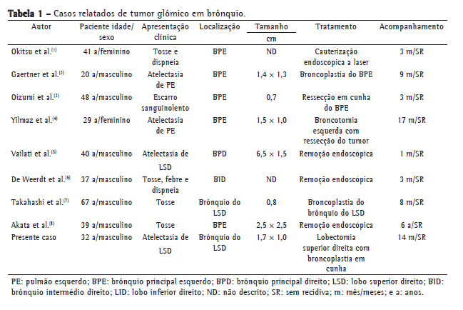 Vários casos de tumor glômico derivado da traqueia ou do parênquima pulmonar foram relatados.(5,8-10) Entretanto, apenas nove casos de tumor glômico derivado do brônquio foram publicados na literatura inglesa, incluindo o caso aqui relatado.(1-8) Até onde sabemos, este é o primeiro relato de caso de tumor glômico endobrônquico causando atelectasia de lobo superior direito (Tabela 1).