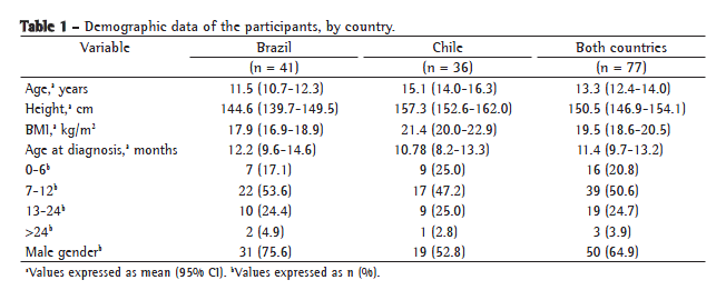 The demographic data are shown in Table 1. In both groups, there was a predominance of males (Brazil: 75.6%; Chile: 52.8%). The overall means (and the group means for Brazil and Chile, respectively) were as follows: age, 13.3 years (11.5 and 15.1 years); height, 150.5 cm (144.6 and 157.3 cm); and BMI, 19.5 kg/m2 (17.9 and 21.4 kg/m2). The onset of the disease occurred between 1 and 24 months of age in most of the patients (97% of the group in Brazil and 97% of the group in Chile).