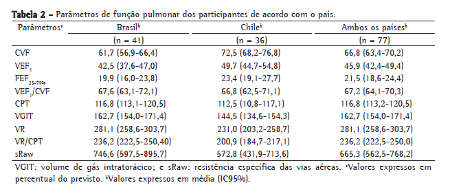 A Tabela 2 mostra os parâmetros de função pulmonar. Em ambos os grupos, os valores médios de todas as variáveis espirométricas, especialmente VEF1 e FEF25-75%, foram baixos. Correspondentemente, os valores médios da maioria das variáveis pletismográficas (VGIT, VR, VR/CPT e sRaw) foram significativamente altos, com exceção da CPT, que ficou dentro dos limites da normalidade.