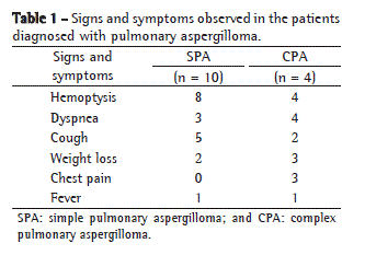 Pulmonary aspergilloma is classified as simple pulmonary aspergilloma (SPA) and complex pulmonary aspergilloma (CPA), based on the radiological aspect, which reveals the nature and extent of the pulmonary impairment caused by the preexisting disease.(3,10,11) The characteristics of SPA include well-localized lesion, thin-walled cavities, and little or no change in the adjacent lung tissue. In CPA, the lesions are disseminated, have thick walls, and are surrounded by parenchymal sequelae resulting from the previous lung disease-in most cases, tuberculosis.(3,5,9,10-12)