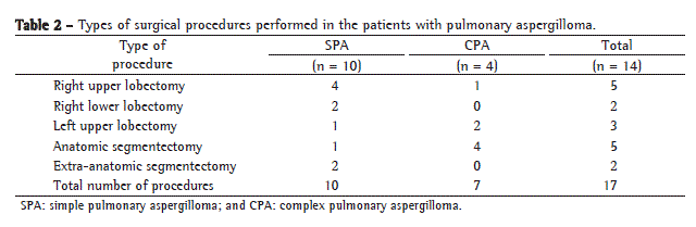 Our objective in this study was to analyze the outcome of the surgical treatment of patients with pulmonary aspergilloma treated at a university hospital.