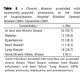 The prevalence of chronic diseases (55.7%) was often the reason for hospitalization among the patients evaluated in the present study, this prevalence being higher (94.1%) among the patients ≥ 60 years of age. Some authors have drawn attention to the occurrence of complications and clinical decompensation of chronic diseases in the presence of pulmonary infection, leading to greater severity of illness.(1-3)