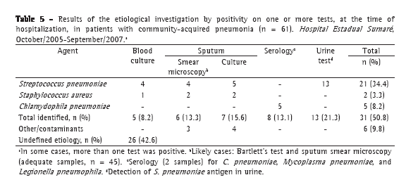 The etiology of CAP was established in 31 patients (50.8%), which confirms data in the literature showing that the etiologic diagnosis is not established in 40-50% of cases of pneumonia, despite the use of a number of existing microbiological and serological methods.(9,11)