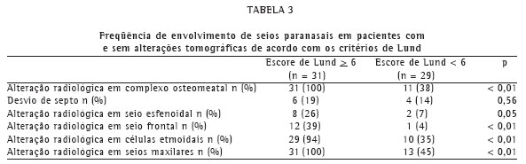 Entre os pacientes com alteração tomográfica, havia anormalidades de seios maxilares em 100%, de células etmoidais em 94%, de seios frontais em 39% e de seios esfenoidais em 26%. Observou-se que todos os pacientes com escore > 6 apresentaram alteração tomográfica do complexo osteomea-tal, enquanto que apenas 11 pacientes com escore < 6 apresentaram este tipo de alteração (38%) (p < 0,01) (Tabela 3). Não houve pacientes com imagem de nível hidroaéreo em seios paranasais.