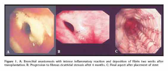Since the number of lung transplantations performed in Brazil has increased, complications related to bronchial anastomosis, especially stenosis, have tended to become more common. Stent placement, albeit a palliative treatment, is the most often used due to the difficulties encountered in the second operations on these patients. The positive result obtained with this patient, together with the absence of complications, is in accordance with the few studies reported to date.