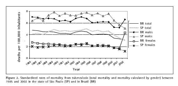 The lower rates of TB mortality, total mortality and mortality calculated by gender found in the city, in relation to the other levels studied, may be attributed both to lower incidences presented as well as to underreporting of cases and deaths. At all three levels, men presented a two or three times higher risk of dying from TB than did women, probably due to the lower rates of incidence among the women living in the city. This also suggests similar lethality rates.