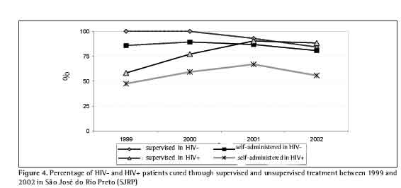 Between 1998 and 2002 in São José do Rio Preto, the proportion of cases of TB/HIV coinfection ranged from 29% to 37%. In 2002, the coverage of supervised treatment in the same year was 65% and 59% respectively, among the coinfected and the non-coinfected. In 2002, the city presented a cure rate of 81% (Figure 4) and a 1% noncompliance rate.