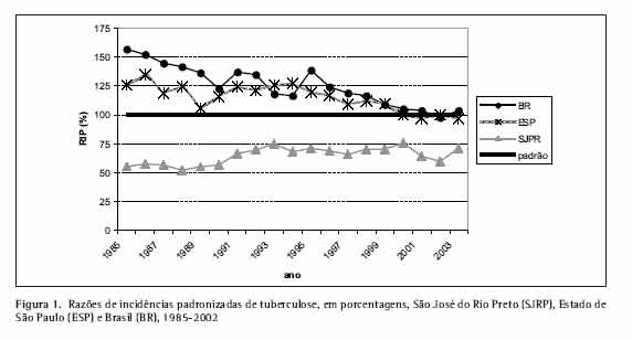 Objetivo: Analisar indicadores de morbidade e mortalidade por tuberculose de São José do Rio Preto, entre 1985 e 2003, comparados com os do Estado de São Paulo e Brasil. Verificar a relação entre risco de ocorrência da doença e níveis socioeconômicos.