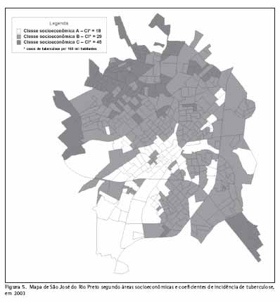 Method: The following official information systems were utilized: the Sistema de Informação de Mortalidade (SIM, Mortality database), the Notificação de Tuberculose (Epi-Tb, Tuberculosis Notification database), the Sistema de Informação de Agravos de Notificação (SINAN, Case-registry database), the Departamento de Informação e Informática do Sistema Único de Saúde (DATASUS, Information Department of the Brazilian Health Ministry) and the Instituto Brasileiro de Geografia e Estatística (IBGE, Brazilian Institute of Geography and Statistics database). New cases reported in 2003 in the urban area were georeferenced and analyzed. A map of the sectors, each classified as representing one of three socioeconomic classes, was drawn up, showing the respective tuberculosis incidence coefficients.