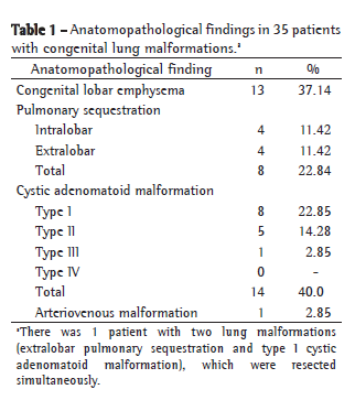 The anatomopathological findings in the 35 patients analyzed are described in Table 1. One patient had type I CAM accompanied by extralobar pulmonary sequestration.