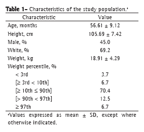 This was a prospective cross-sectional study. The target population consisted of healthy preschool children, 3-6 years of age, selected by simple sampling at public schools, private schools, and public day care centers in the city of Recife, Brazil, and evaluated between February of 2005 and December of 2006. Of the 682 schools and day care centers, 17 were selected by random sampling. From those 17 facilities, a total of 315 children were recruited. Because the present study also aimed to generate reference values, only the children considered to be free of respiratory diseases (asthma and other acute and chronic respiratory diseases) underwent testing. For classifying children as normal, we used the ATS questionnaire known as ATS-DLD-78-C, which is recommended by the Epidemiology Standardization Project and has been adapted and validated for use in Brazil(12) The questionnaire was completed by the parents or legal guardians of the children. For calculating the sample size, we considered the value of 70% as the expected frequency for tests with good reproducibility, in accordance with the study conducted by Nystad et al.(4)